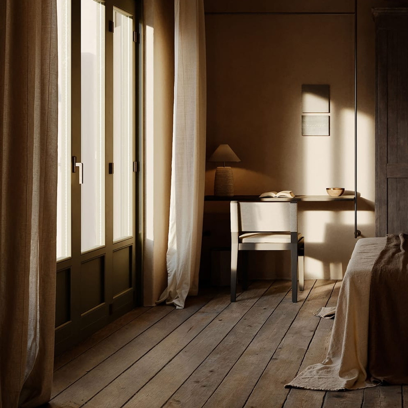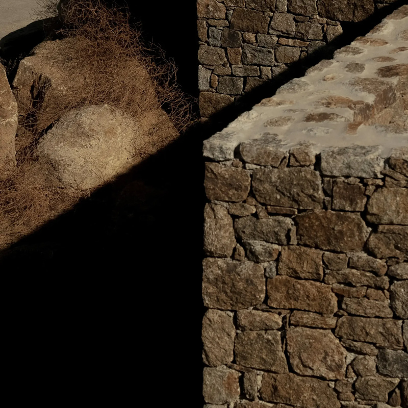 Armacaas’s architecture draws from the landscape rather than imposing upon it: dry stone, wood, raw concrete, natural textures unified by an aesthetic of restraint. The lines follow the curves of wind-swept hills; the dry-stone walls shaping the island’s relief are respected and integrated. The style is organic, attuned to the surrounding nature, as though the buildings had always been there, carved into the rock itself. The result is a space where every element, window, terrace, pool, converses with the light, the shadows, the sea and the sky. This minimalist design gamble, where less means more, gives Armacaas its distinctive character and quiet strength.