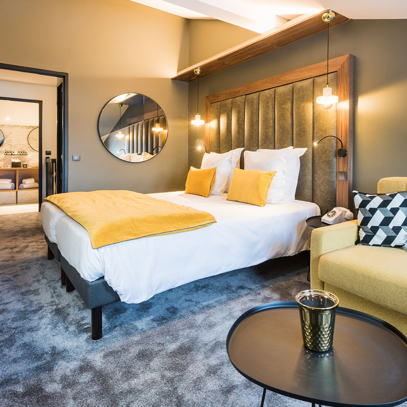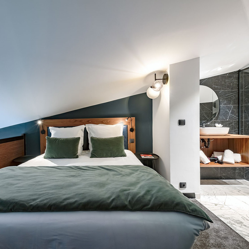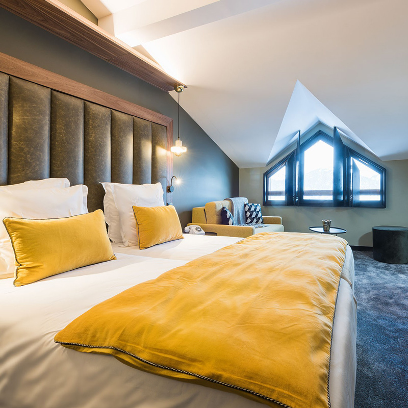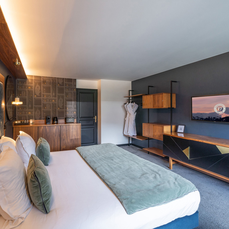 Opened in 2017, the hotel offers several types of rooms offering absolute comfort and a cocooning atmosphere. The Double and Triple Rooms are available in three atmospheres with a chic and vintage design: khaki and yellow, green and pink, blue and gray. The headboards were made to measure, in leather and solid wood. The Family Rooms and the Family Duplex are spacious family suites from 38 to 50 m2. They are organized either on one floor or in duplex. Most of the rooms and suites offer a balcony, with a view of the slopes to live to the rhythm of the snow front or of the valley to enjoy a breathtaking panorama of the valley.