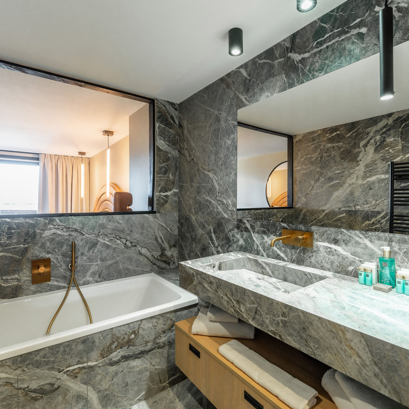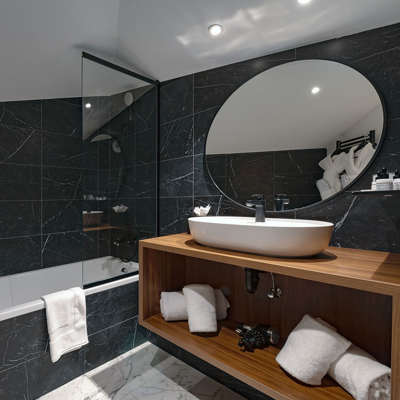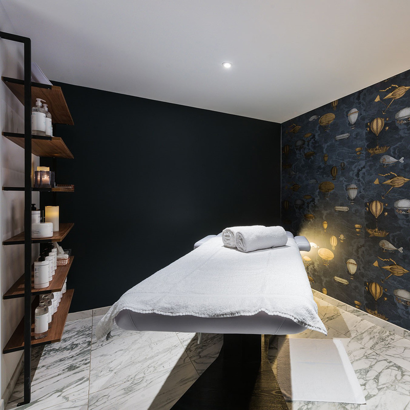 The spaces decorated by Véronique Vidoni, display a retro and modern style at the same time. There are dial telephones, black & white photos, Marshall speakers, art deco patterns and dark tones that contrast with the whiteness of the tracks. The bathrooms have a shower or a bathtub and Rituals Paris hospitality products.