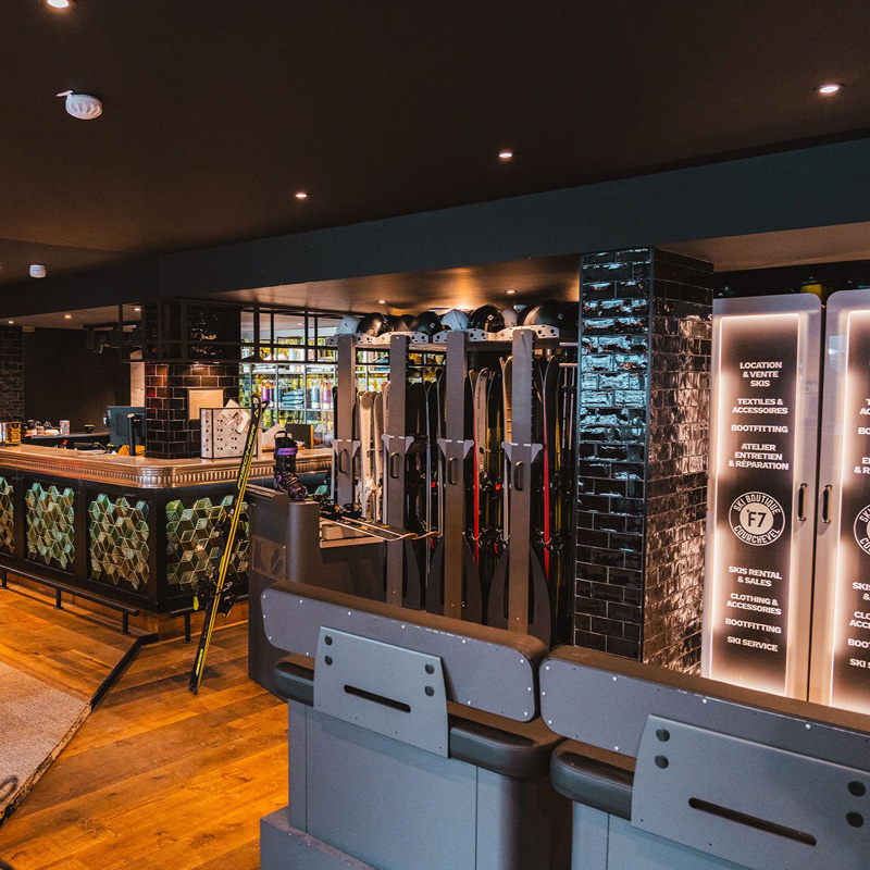 The Ski room is a space entirely dedicated to skiing, to equip yourself, but also to relax. It is directly open to the snow front, at the starting point of the ski lifts and the kindergarten. The Ski Bar, open all day, offers hot drinks and cocktails.