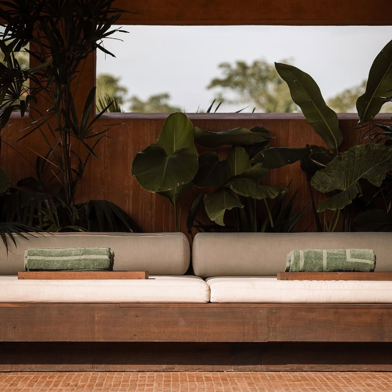 The architectural design is the work of Italo-Australian firm MORQ, masters of sensual brutalism. Their buildings, with pure and silent lines, celebrate raw concrete, perforated Balinese brick, shifting shadows, and mineral textures. Inside, interior designer Amy Wenden (Studio Wenden) brings a wabi-sabi aesthetic, weathered leather, travertine, charcoal tones, and raw textiles unite in a warm, tactile, and intimate atmosphere. It’s a beauty that doesn’t seek to impress, but to ground.