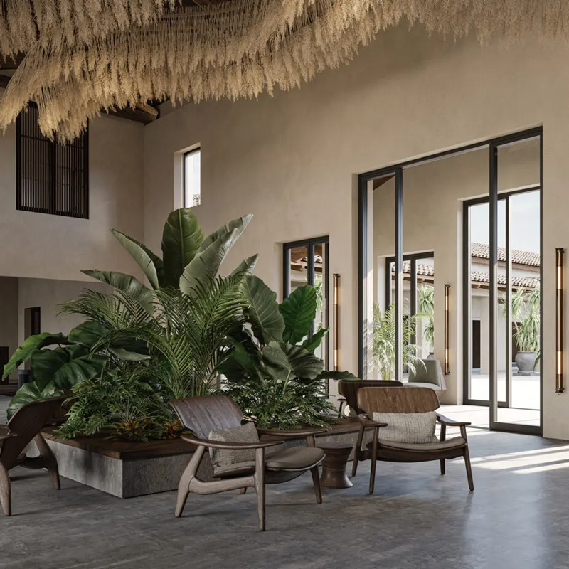 Following the success of OKU properties in Ibiza and Kos (Greece), the lifestyle brand unveils its new gem on the Costa del Sol, nestled in an enchanting setting between the sea and the mountains. OKU Andalusia embodies the brand’s signature style that has made it a success: sophisticated bohemian aesthetics, minimalist design, open spaces, and architecture in harmony with the natural surroundings. Natural materials, earthy tones, and clean lines create a serene and refined atmosphere. Indoor and outdoor spaces blend seamlessly, with communal areas featuring three infinity pools surrounded by palm trees, offering an idyllic setting for relaxation.