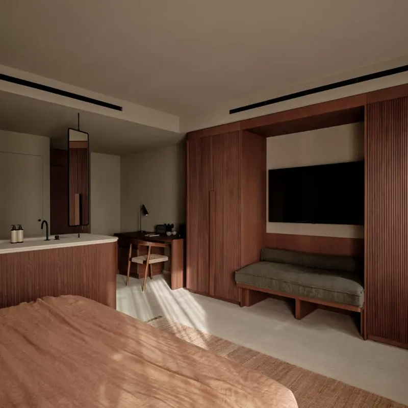 The hotel offers a variety of accommodations tailored to all travelers. From one- and two-bedroom suites ideal for families and friends to swim-up suites with direct pool access, and spacious penthouses with vast sun-drenched terraces. For the ultimate experience, a private four-bedroom villa with an infinity pool, fully equipped kitchen, and living room is also available. Each accommodation combines absolute comfort with refined elegance, showcasing natural materials and a keen attention to detail.