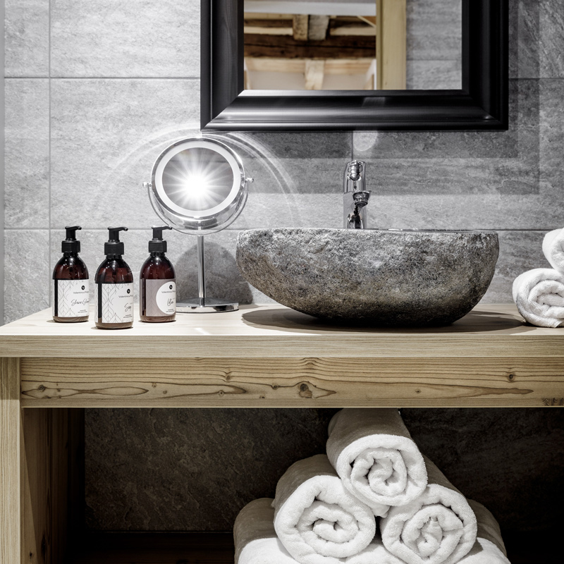 The chalet boasts a private natural swimming pond, heated to around 24°C, where you can immerse yourself in nature, soothed by silence and birdsong. There is also a private wellness area with a Klafs Sanarium sauna, adjustable to suit your mood: traditional sauna or gentle steam bath, for a fully customised experience. This cocoon of wellbeing enhances the sense of escape and relaxation.