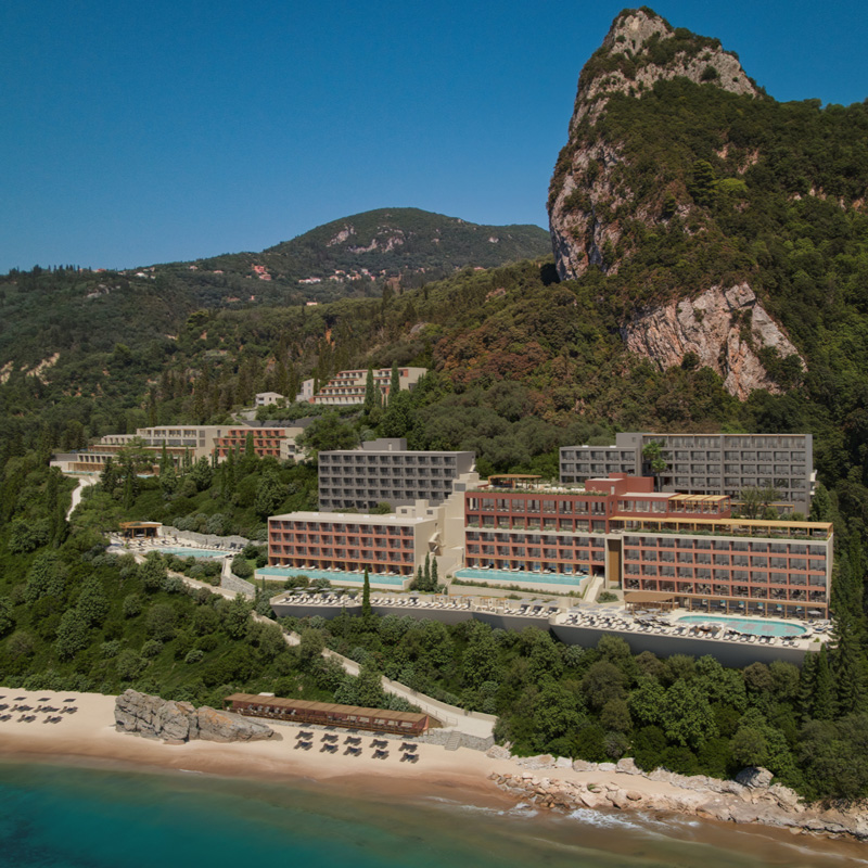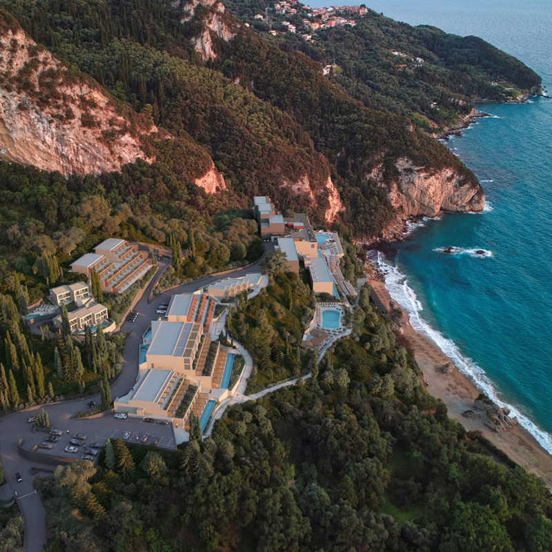 À l’ouest de Corfou, face à la mer Ionienne et à ses couchers de soleil à couper le souffle, se niche Agios Gordios : un village balnéaire paisible, enveloppé de montagnes verdoyantes et bordé d’une plage dorée. C’est ici que s’élève l’Álkyna Lifestyle Beach Resort, à flanc de falaise, comme suspendu entre les éléments. À toute heure du jour, la vue se transforme en spectacle. Le bleu intense de la mer, le sable doré de la plage privée, les oliviers centenaires, les criques sauvages… tout respire l’évasion. L’ambiance y est résolument sereine, sophistiquée, loin du tumulte touristique, proche de l’essentiel.