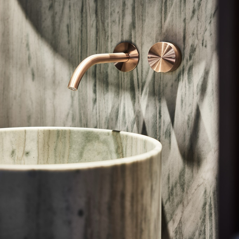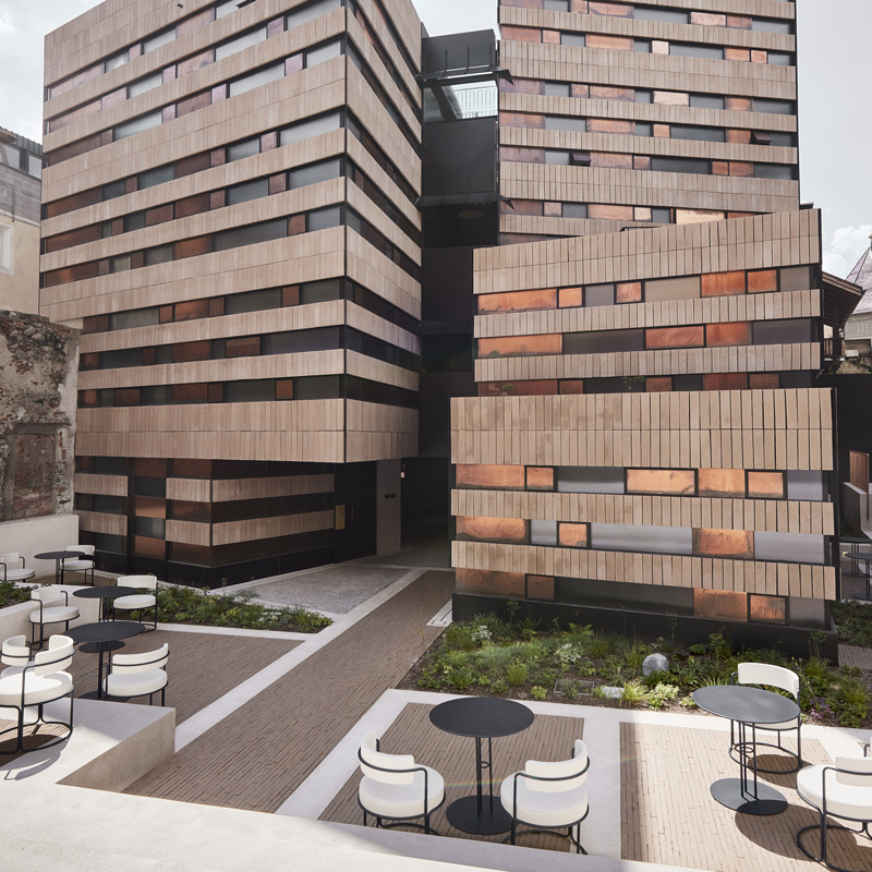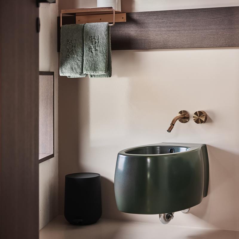 Ce projet réalisé par le cabinet Bergmeisterwolf Architects, allie l’architecture des bains à une force contemporaine et au respect du patrimoine. Conçu comme un lieu perméable, il se dévoile par plusieurs entrées, traversé de perspectives et de deux tours qui rythment la verticalité. Les façades racontent une histoire de matières : briques d’argile façonnées à la main, cuivre inspiré des anciennes canalisations, verre rainuré laissant filtrer la lumière sans dévoiler l’intimité, et acier noir en contraste discret. L’intérieur dessinés par les architectes a été réalisé par un menuiser local, joue sur un vocabulaire raffiné où chaque détail compte : sols en frêne peint vert pâle rappelant l’eau, luminaires gainés de soie, robinets et interrupteurs en cuivre patiné. L’art s’invite également dans le projet, avec des œuvres de l’artiste Michael Fliri, comme un ciel étoilé liquide ou une sculpture de peignoir suspendu, qui rappellent la poésie de l’eau et des gestes du quotidien.