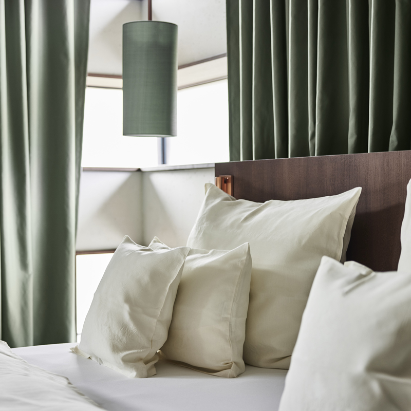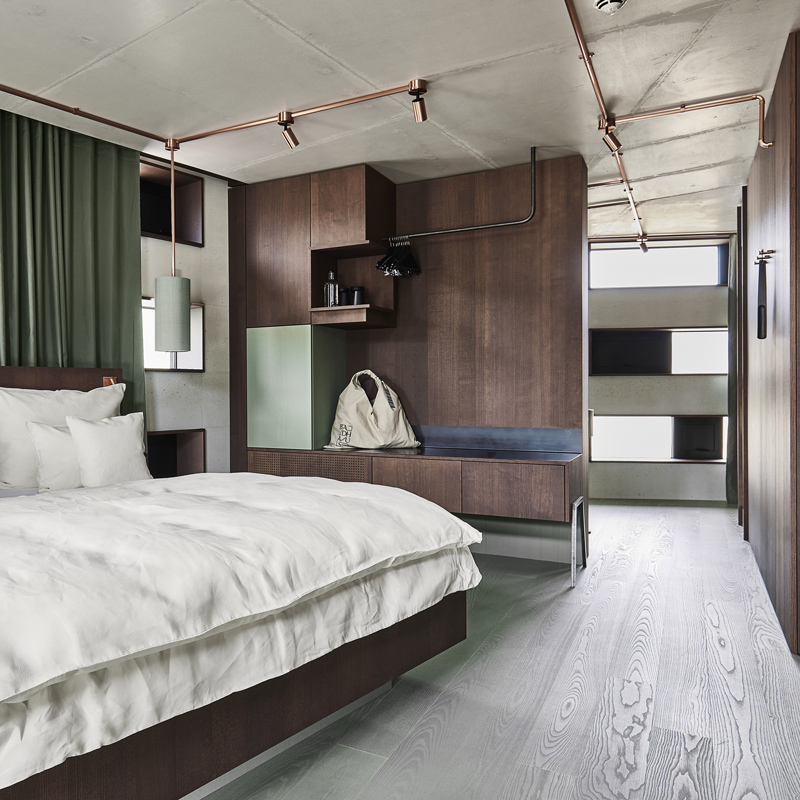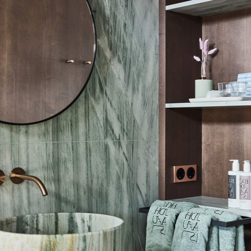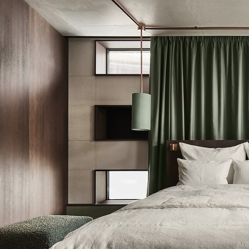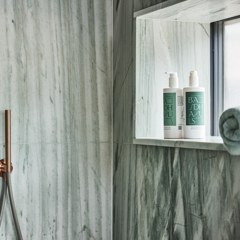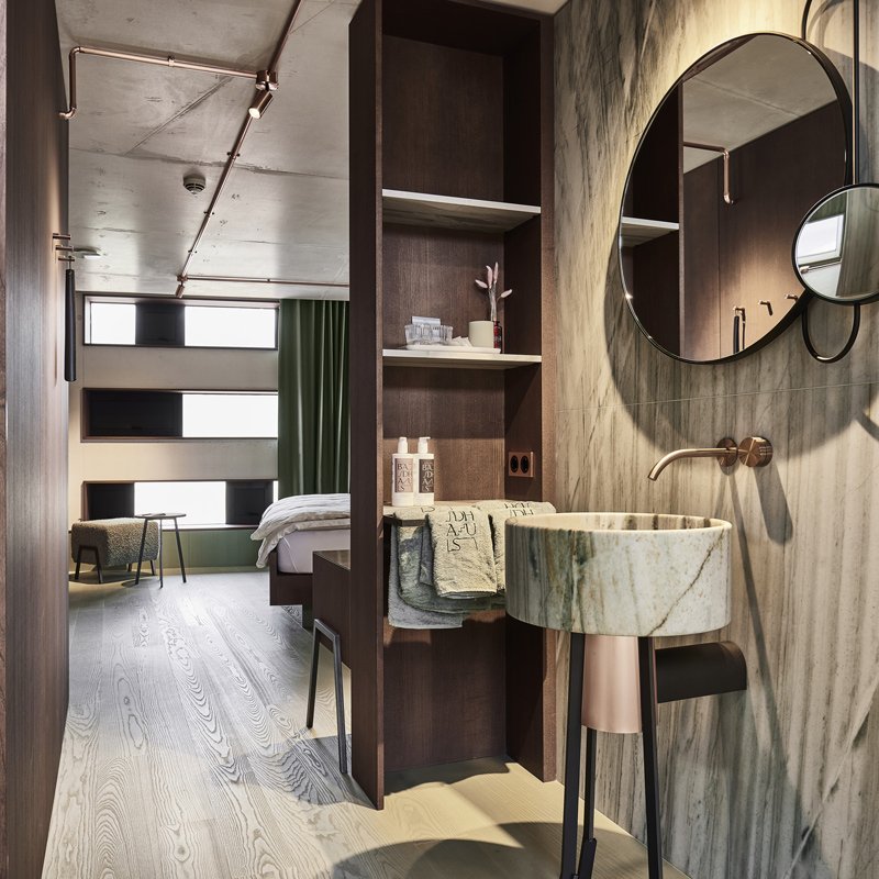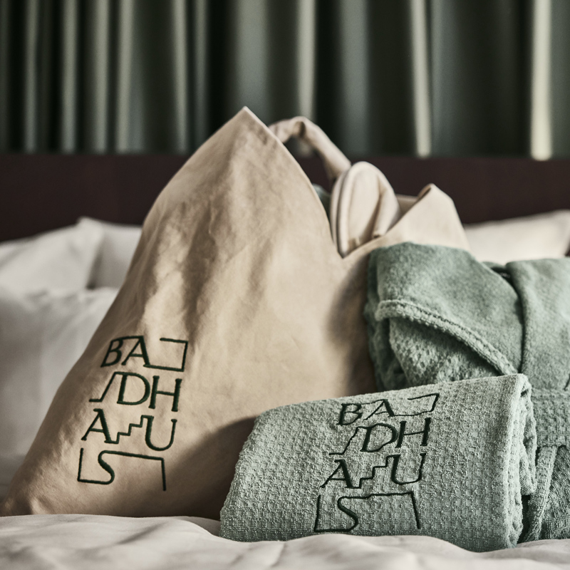Le Badhaus propose 21 chambres réparties en cinq catégories, toutes pensées comme des cocons contemporains. La pierre, le bois et le cuivre composent un univers apaisant, tandis que les couleurs évoquent la culture des bains. Les salles de bain se parent de quartzite vert, avec des vasques sculptées dans un seul bloc de pierre et des pieds en cuivre. Les textiles, confectionnés exclusivement en Italie, privilégient le lin et le coton de qualité. Chaque détail raconte une esthétique simple mais profondément luxueuse, où le confort se marie à une atmosphère feutrée.