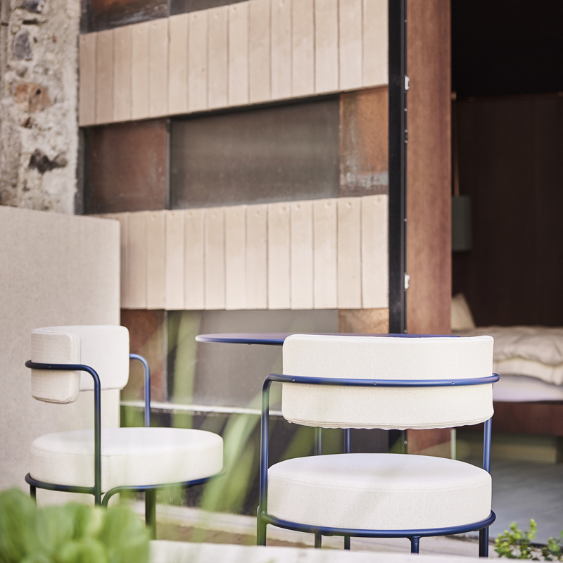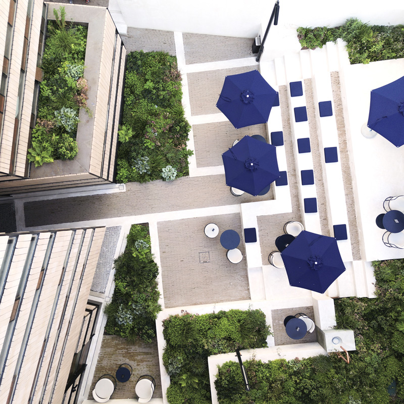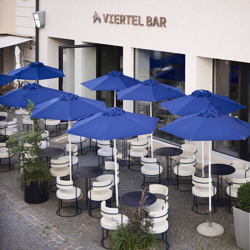 L’esprit originel du lieu – celui de la rencontre – trouve naturellement son prolongement dans la cour intérieure et au Viertel Bar. Une terrasse végétalisée, nichée aux étages supérieurs, offre une vue sur les collines viticoles environnantes. Là, au-dessus des toits des maisons médiévales, il fait bon rêver et laisser vagabonder son esprit. Pour une parenthèse bien-être, les hôtes bénéficient de packages exclusifs à l’Acquarena, vaste complexe de bains et de wellness avec saunas et espaces de détente sur rooftop, situé à seulement 200 mètres. Un sac de bain avec peignoir, serviette de sauna et chaussons est gracieusement mis à disposition. Côté services, l’hôtel dispose également d’un parking design imaginé par l’artiste Harry Thaler, doté de plafonds réfléchissants et d’un système futuriste de LED, rappelant que l’esthétique imprègne le moindre détail de l’expérience. Cette arrivée en garage constitue déjà une expérience à part entière.