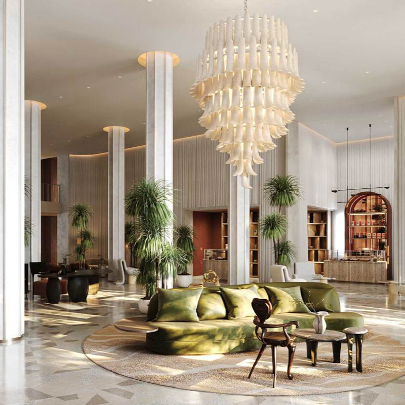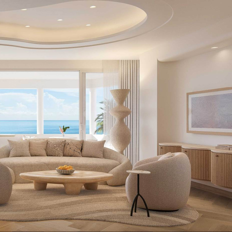 Le bâtiment lui-même, une tour blanche élancée, s’inscrit dans la tradition moderniste de Miami Beach. Mais c’est à l’intérieur que la magie opère véritablement. À l’origine, le design du Delano a été confié à Philippe Starck, dont la vision audacieuse a profondément marqué l’identité du lieu. Aujourd’hui revisités, les espaces conservent cette signature : volumes spectaculaires, jeux de lumière subtils, rideaux diaphanes et mobilier sculptural. Le lobby, véritable pièce maîtresse, impressionne par sa hauteur sous plafond et son esthétique presque onirique. Les espaces communs oscillent entre minimalisme élégant et touches baroques, créant une ambiance unique, à la fois intemporelle et résolument contemporaine. À l’extérieur, les jardins tropicaux prolongent cette expérience sensorielle, avec une mise en scène paysagère pensée comme un parcours immersif jusqu’à l’océan.
