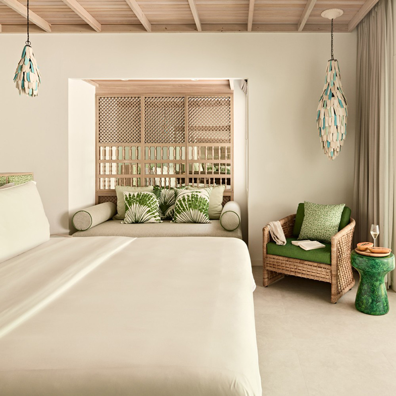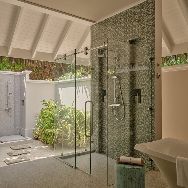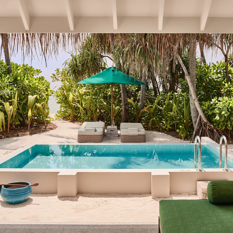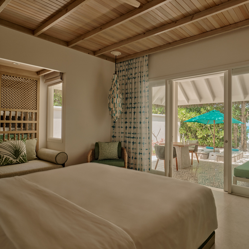 Les 125 villas du resort sont l’œuvre des designers londoniens Muza Lab, qui ont su traduire les nuances naturelles de l’océan en une palette vibrante et séduisante. Certaines villas sont installées sur la plage, d’autres sur la lagune ou sur pilotis, et 79 disposent de leur propre piscine privée. Les intérieurs marient matériaux naturels, lignes épurées et couleurs audacieuses, offrant un confort luxueux et une intimité totale. L’architecture célèbre la lumière et la transparence, et certaines villas permettent même de dormir, se détendre et prendre une douche en plein air, fusion parfaite entre luxe et nature.