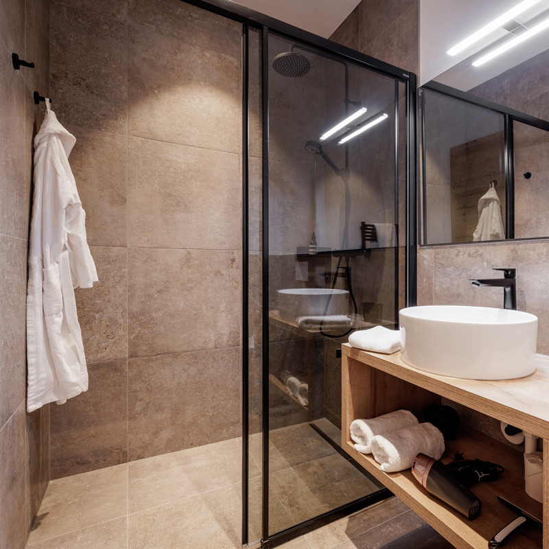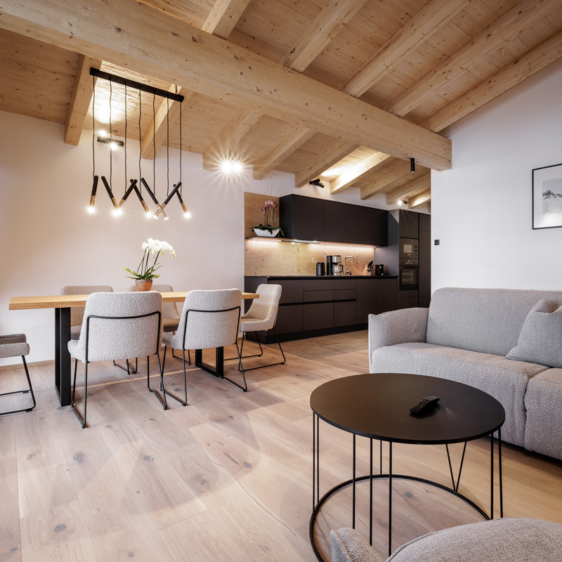 L’architecture du Lodge joue la carte du bois naturel, sapin, mélèze et pin cembro, valorisant la matière locale et authentique. Le style « modern-alpin » se manifeste dans des lignes épurées, des volumes aérés et des finitions élégantes : grands espaces, mobilier sur mesure, pierres et textiles naturels dialoguent harmonieusement. Chaque appartement est pensé comme un cocon : baies vitrées, balcons panoramiques, textures douces… le design est chaleureux, minimaliste mais jamais froid.